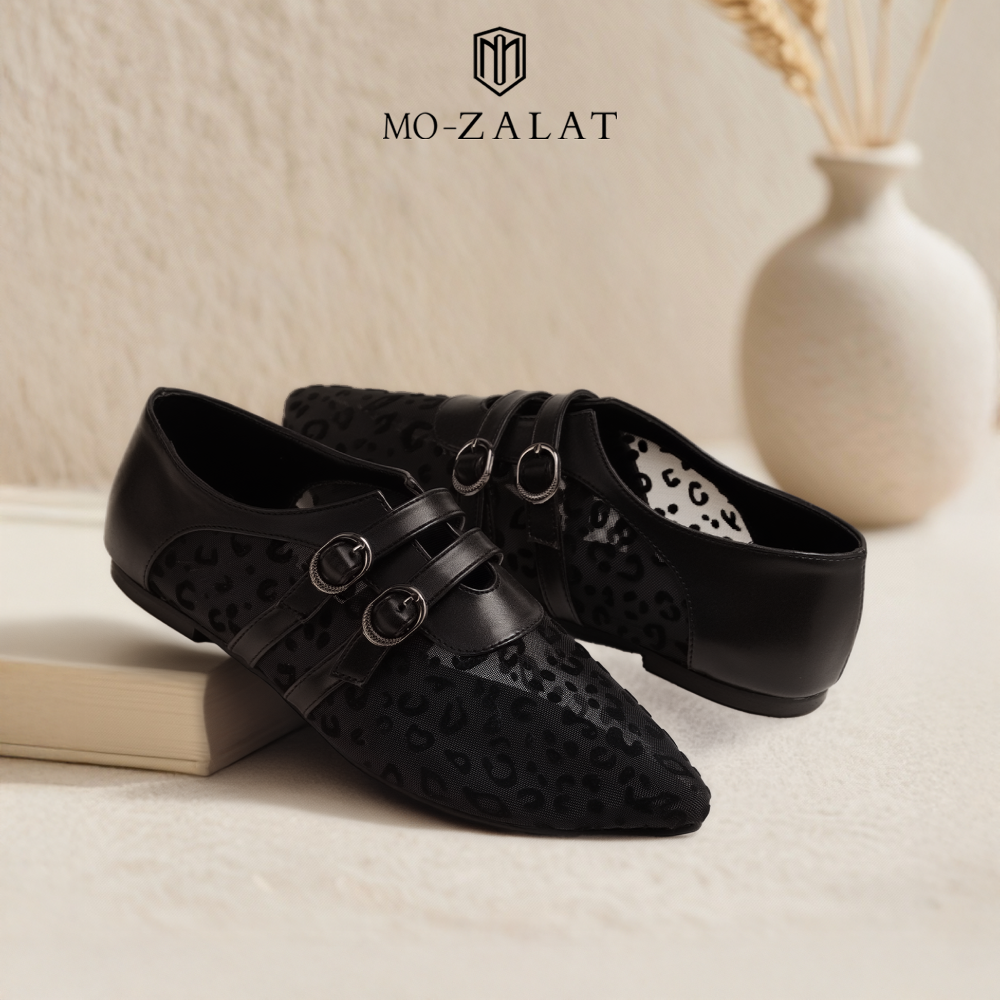 حذاء فلات انيق بتصميم شيك جديد يمنحك اطلالة بسيطة و ناعمة .مصنوعة من الفالية المطبوع و مطعم بالجلد . مناسب جدا و عملي للاستخدام اليومي.