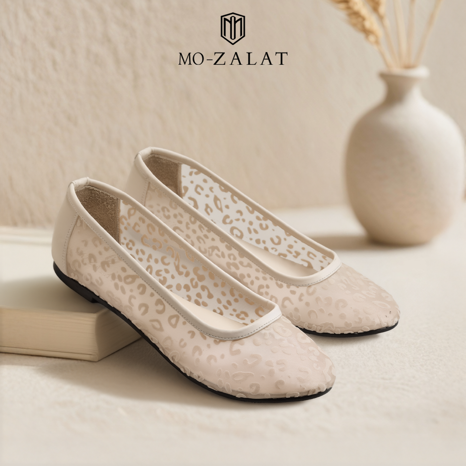 حذاء فلات خفيف يمنحك اطلالة بسيطة و ناعمة .مصنوعة من الفالية المطبوع و مطعم بالجلد . مناسب جدا و عملي للاستخدام اليومي.